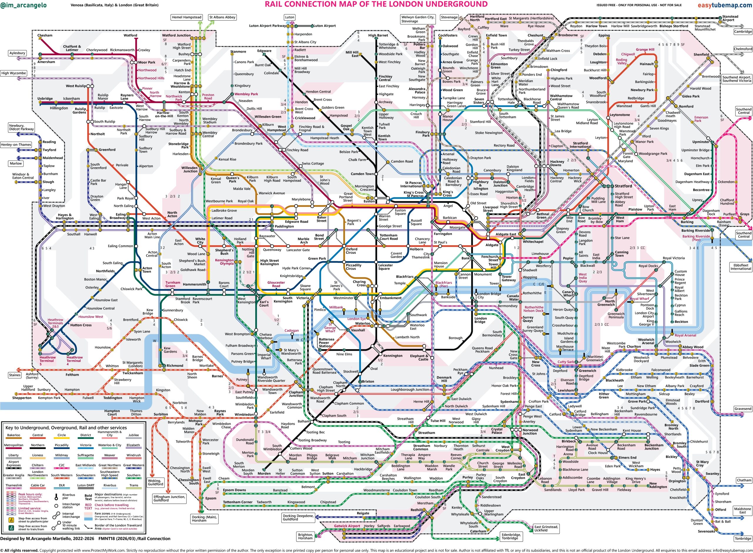 Welcome to this new Rail and Tube Map - designed to complement the Easy To Read Tube-only Map. The diagram of lines has been built along major rail and tube routes to provide a clear overview of London's transport network. Bold text highlights the most frequently searched destinations, while red text indicates information to check before travelling. Stations across different fare zones and those with special fares are shown using pink background areas. It is designed for both neurodivergent and neurotypical users.