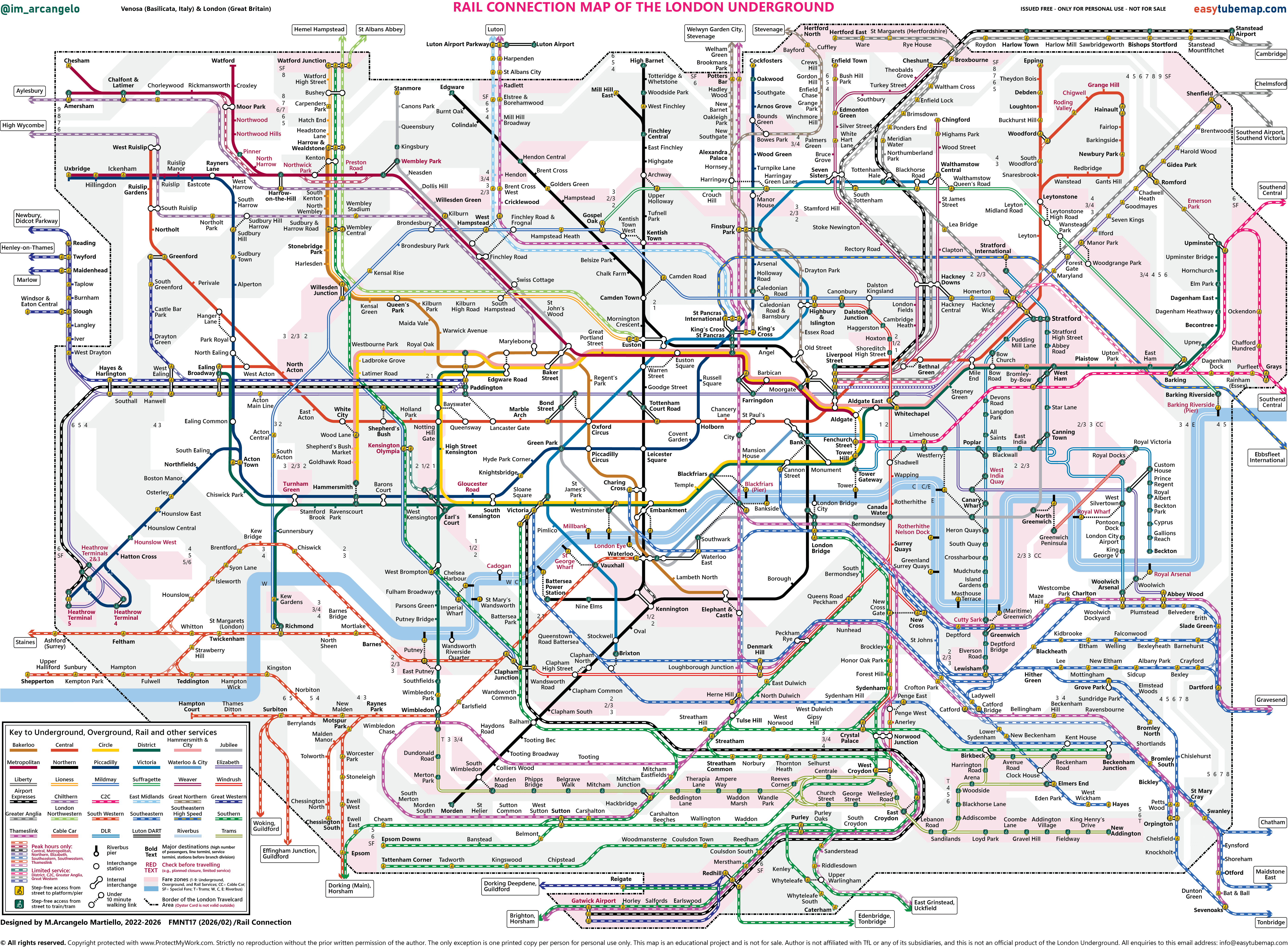 Welcome to this new Rail and Tube Map - designed to complement the Easy To Read Tube-only Map. The diagram of lines has been built along major rail and tube routes to provide a clear overview of London's transport network. Bold text highlights the most frequently searched destinations, while red text indicates information to check before travelling. Stations across different fare zones and those with special fares are clearly shown using pink background areas. It is designed for both neurodivergent and neurotypical users.